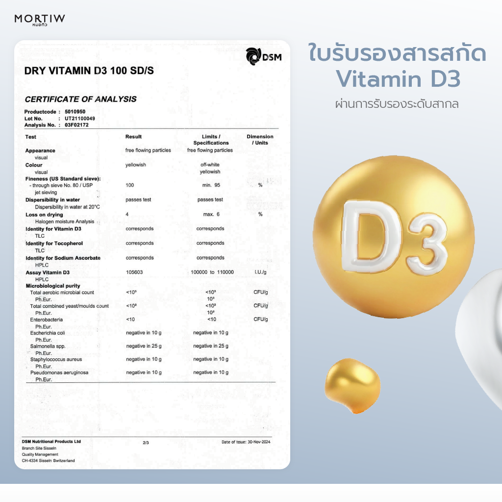 – Vitamin D3 100000 IU/g. (วิตามินดี 3 100000 ไอยู/ก.) 2 mg