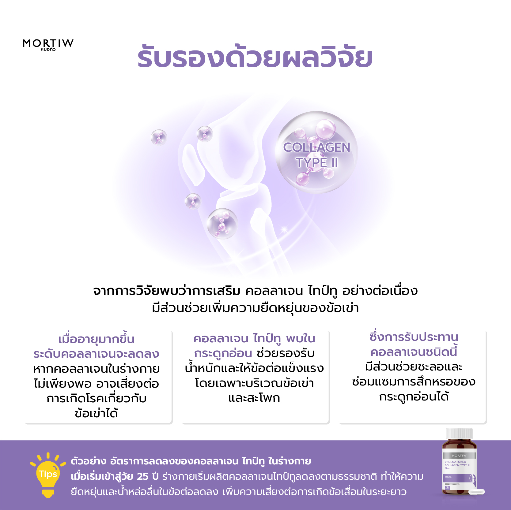 • เมื่อเริ่มเข้าสู่วัย 25 ปี ร่างกายจะเริ่มผลิตคอลลาเจนลดลงตามธรรมชาติ ซึ่งส่งผลให้ความยืดหยุ่นของข้อต่อลดลง และน้ำหล่อลื่นในข้อต่อเริ่มลดน้อยลง ส่งผลให้มีโอกาสเกิดข้อเสื่อมในระยะยาว