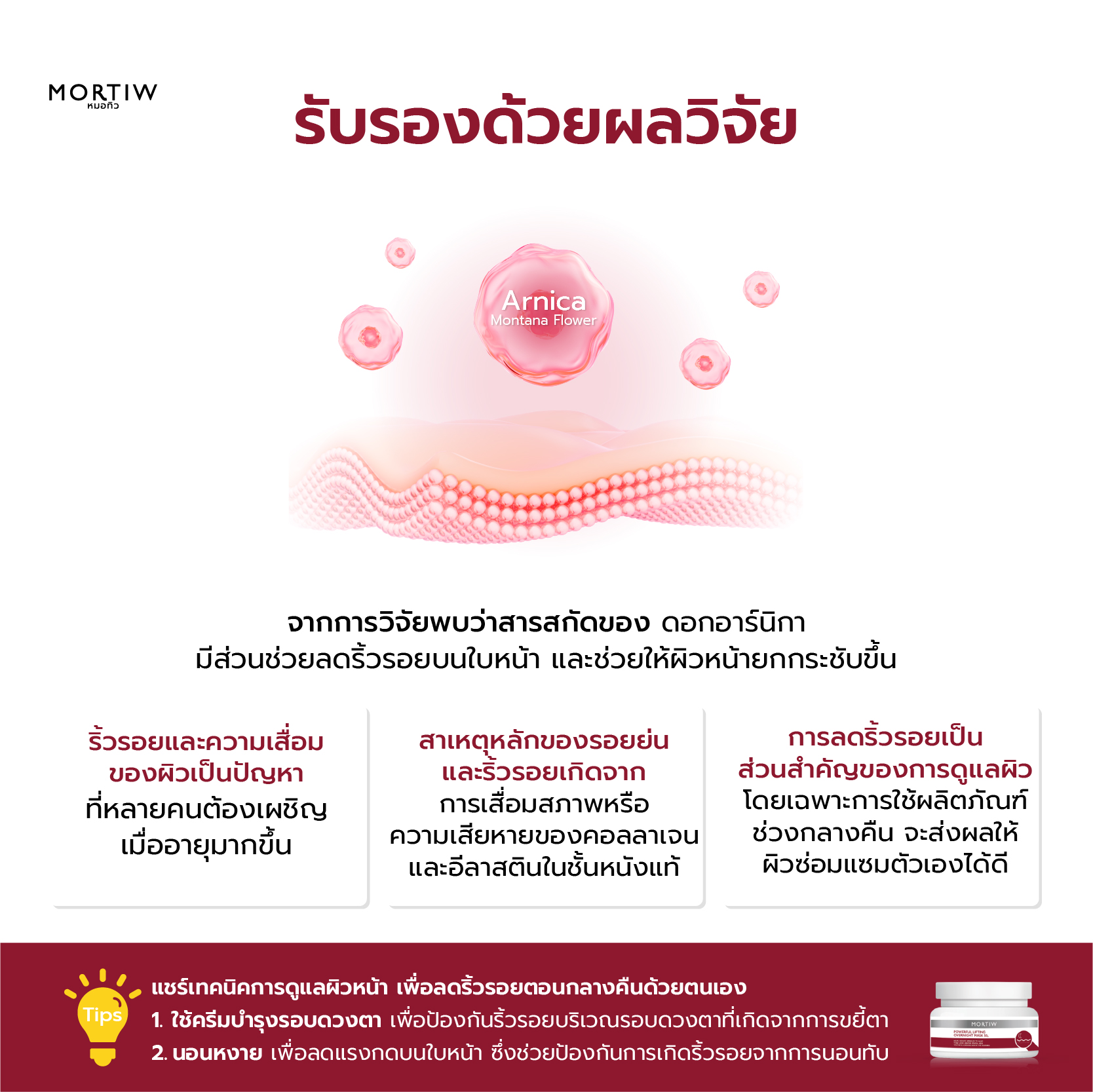ริ้วรอยและความเสื่อมของผิวพรรณเป็นสิ่งที่หลายคนต้องเผชิญเมื่ออายุมากขึ้น หรือเมื่อผิวได้รับผลกระทบจากมลภาวะและรังสี UV จากแสงแดด สาเหตุหลักของรอยย่นหรือริ้วรอยบนผิวหนังเกิดขึ้นเมื่อโครงสร้างคอลลาเจนและอีลาสตินในชั้นหนังแท้ (Dermis) เสื่อมสภาพหรือถูกทำลาย การยกกระชับผิวและลดเลือนริ้วรอยจึงเป็นกระบวนการที่สำคัญสำหรับการดูแลผิว โดยเฉพาะในช่วงกลางคืนที่ผิวสามารถซ่อมแซมตัวเองได้อย่างเต็มที่ การใช้ผลิตภัณฑ์ที่ช่วยเสริมการทำงานของผิวในช่วงเวลานี้สามารถทำให้ผิวดูสดใส อ่อนเยาว์ และยืดหยุ่นมากขึ้น
