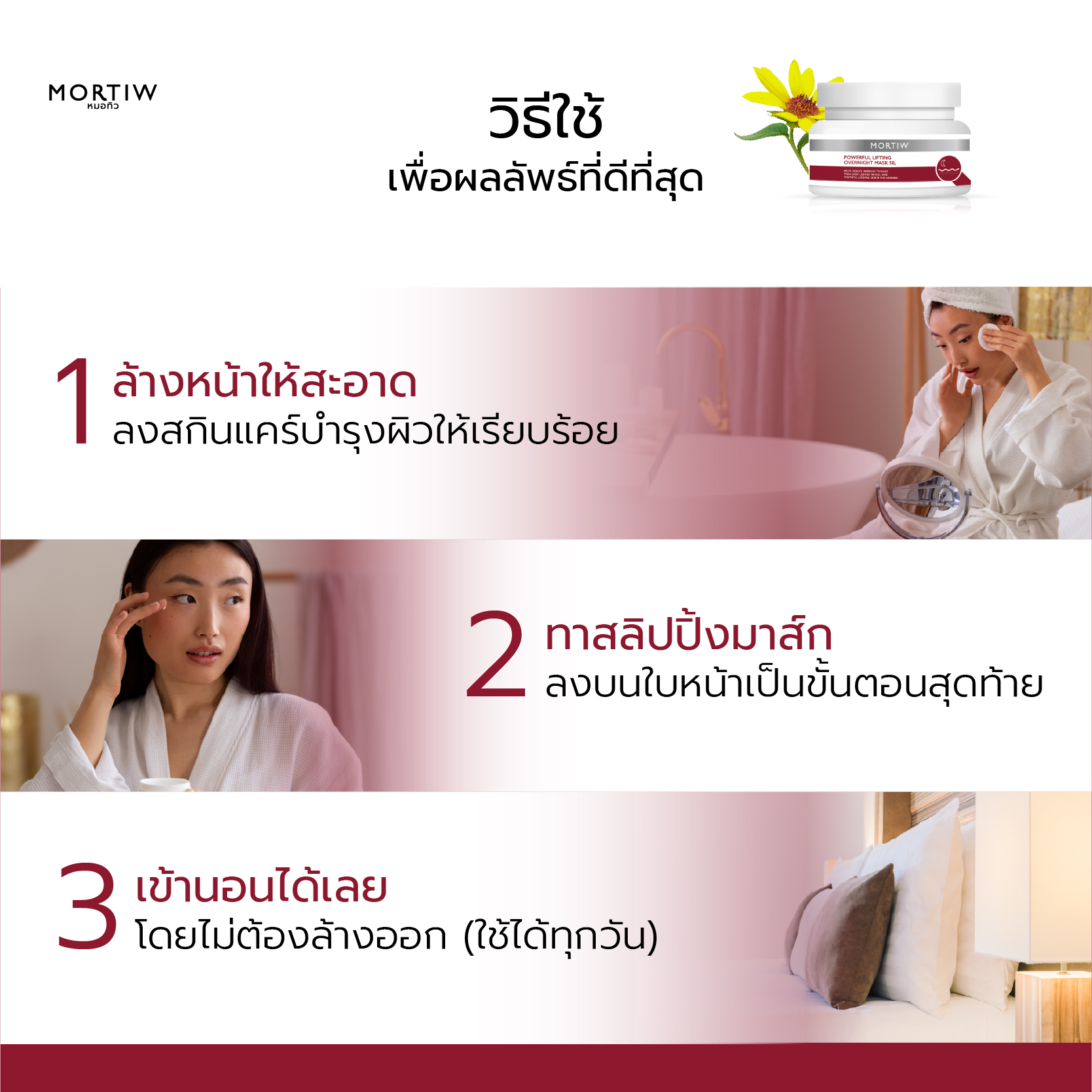 5. ทิ้งไว้ข้ามคืน ปล่อยให้มาร์กทำงานขณะคุณหลับ สลิปปิ้งมาร์กจะทำหน้าที่ฟื้นฟูและบำรุงผิวอย่างล้ำลึกตลอดคืน