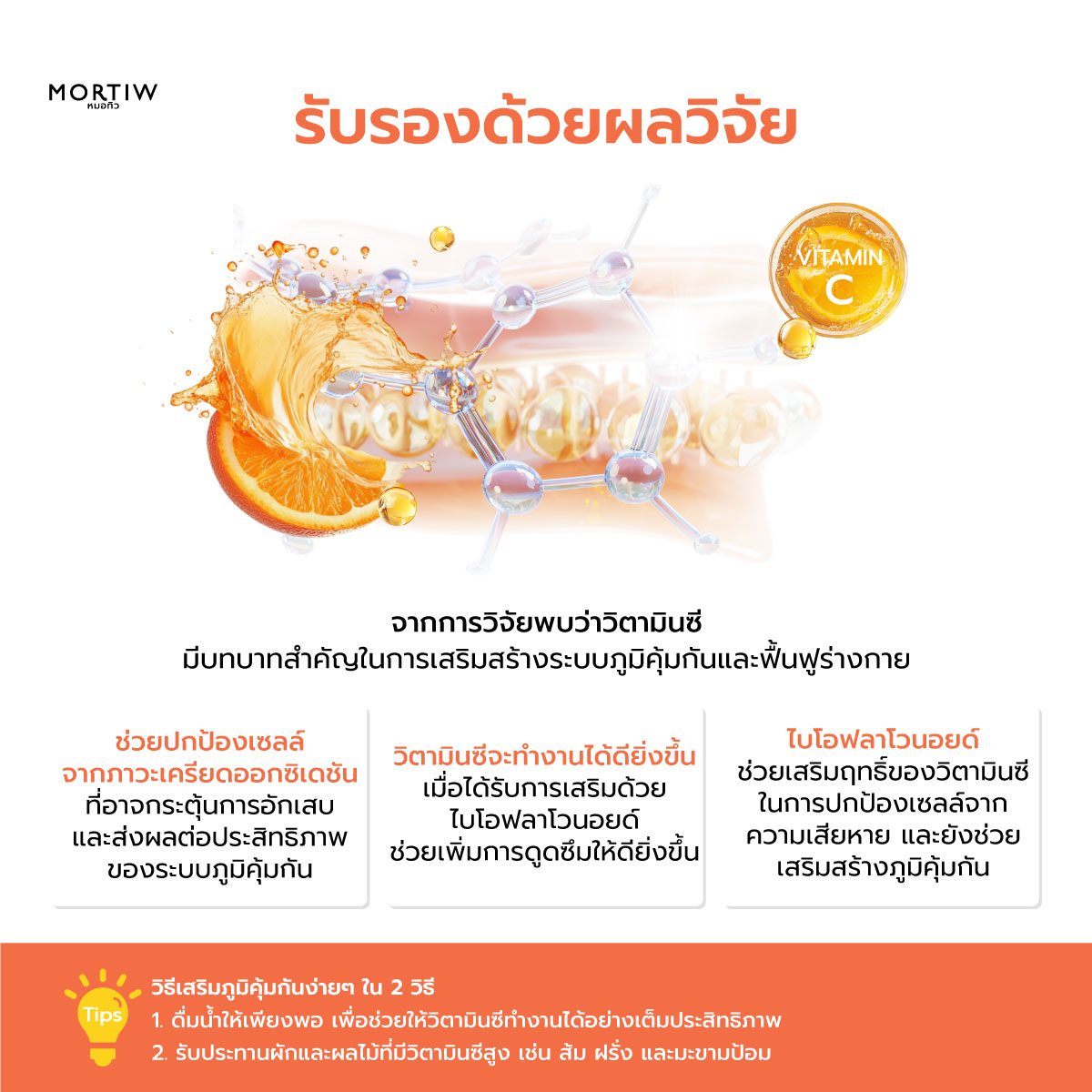 วิตามินซีเป็นสารอาหารที่มีบทบาทสำคัญในการเสริมสร้างระบบภูมิคุ้มกันของร่างกาย โดยช่วยกระตุ้นการผลิตเม็ดเลือดขาว ซึ่งเป็นแนวป้องกันด่านแรกในการต่อต้านเชื้อโรคและสิ่งแปลกปลอม อีกทั้งยังทำหน้าที่เป็นสารต้านอนุมูลอิสระ ช่วยปกป้องเซลล์จากภาวะเครียดออกซิเดชันที่อาจกระตุ้นการอักเสบและส่งผลต่อประสิทธิภาพของระบบภูมิคุ้มกัน เมื่อลำเลียงเข้าสู่ร่างกาย วิตามินซีจะทำงานได้ดียิ่งขึ้นเมื่อได้รับการเสริมด้วย ไบโอฟลาโวนอยด์ ซึ่งเป็นสารประกอบจากธรรมชาติที่พบในผักและผลไม้ โดยมีคุณสมบัติช่วยป้องกันการสลายตัวของวิตามินซี ทำให้วิตามินซีมีความเสถียรและออกฤทธิ์ได้นานขึ้น อีกทั้งยังช่วยเพิ่มการดูดซึมของวิตามินซีให้มีประสิทธิภาพมากขึ้น